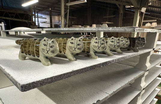 「にっぽんのリサの猫」を作ることになって、まっさきに思い浮かべたのは、益子焼のT工房のKさんのことだ。これまで、定番の平皿や湯呑み、森と動物の絵皿シリーズ、「くまもとのくま」に、「にっぽんのハリネズミ。」といった作品を手掛けていただいていて、リサのジャパンシリーズにはなくてはならない工房だ。