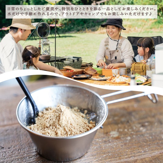 最後にきな粉をふりかければ完成です。 保存料・着色料 不使用の原材料なので、 安心してご家族でご利用いただけます。