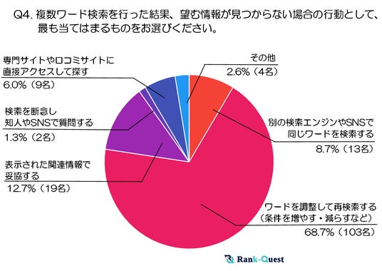 最も多かった行動は「ワードを調整して再検索する」(68.7%)で、過半数以上の人が条件を増減したりキーワードを入れ替えたりしながら、再度検索を試みていることがわかります。