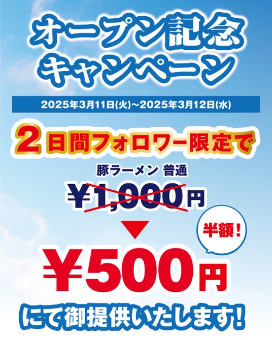 instagram公式アカウントをフォローした方限定で、2025年3月11日(火)~2025年3月12日(水)の2日間で「豚ラーメン 普通 (¥1,000)」をワンコイン500円でプレゼント!