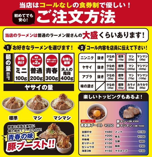 当店は、青春系二郎ラーメンがコンセプト。学生時代に食べたあの味をもう一度、、肉と脂と野菜を口いっぱいに頬張り、あの頃に食べた青春の味を感じて頂ければ幸いです。ラーメンは、濃密な豚骨スープとコシのある太麺、じっくり煮込んだチャーシューが、食欲をそそる一品。初めての方でも安心してご利用して頂ける工夫をしております。厳選した国産豚と新鮮な素材を用いており一度味わえば、その濃厚さと安心の美味しさに虜になること間違いなし。是非至福のラーメンをご体験ください!