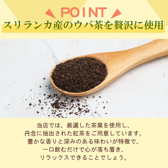 当店では厳選した茶葉をご用意しています。スリランカ産のウバ茶を贅沢に使用し、茶葉本来の鮮度と風味を保つため、テトラ型ナイロンメッシュのティーバッグを採用。お湯を注ぐと茶葉がゆっくり広がり、豊かな味わいを引き出します。