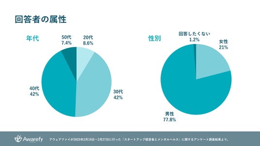 株式会社Awarefy(本社:東京都新宿区、代表取締役 CEO 小川 晋一郎、以下「アウェアファイ」)は、厳しい環境におかれるスタートアップ経営者のメンタルヘルス環境の実態を明らかにする目的で、2025年2月19日から27日にかけてオンライン上で匿名のアンケートを実施いたしました。なお、本アンケートの回収にあたっては、ANRI株式会社を中心とした6社のベンチャーキャピタルに協力をいただいています。