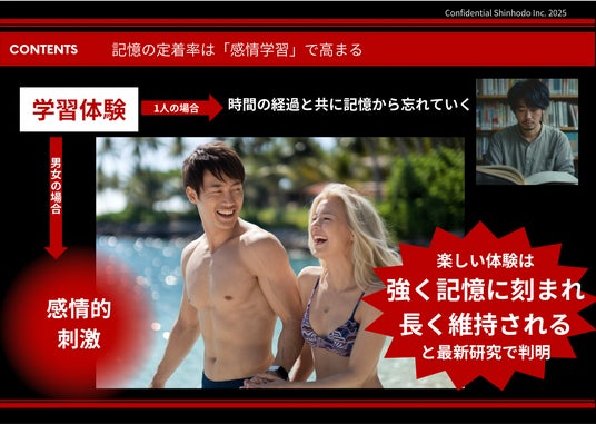 脳科学の研究により、私たちは「感情が伴う出来事の方が、記憶定着率が高くなる」ということも分かっています。特に恋愛や好意を持った相手とのコミュニケーションは熱い感情が伴うため、楽しいと感じます。最新の研究では、1人で記憶した時より、男女で“楽しい体験”をした場合に記憶がより長く保持できることがわかりました。この研究結果を元に、弊社のプログラムではオンラインレッスンの中でも「楽しい体験」ができるように恋愛のロールプレイングをレッスンに組み込みました。