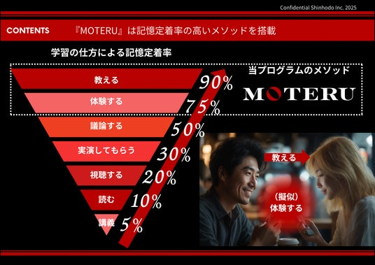 学習の記憶定着率は、学び方によって大きく異なることが研究で明らかになっています。その中でも、最も効果的な学習方法は「体験する」と「教える」であるとされています。弊社の『MOTERU』は、この上位2つの学習方法を取り入れたプログラムになっています。