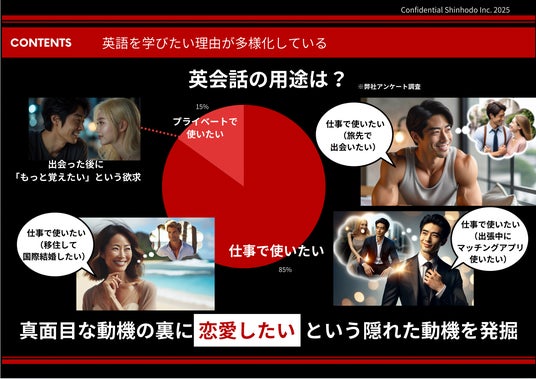 「最高の人類体験を、教育から。」をミッションに掲げる株式会社進鳳堂は、顧客からヒアリングした学習のきっかけに潜む潜在的な動機を元に、これまで公に語られてこなかった「国際恋愛」需要に対応できる英会話プログラムの作成を開始いたしました。