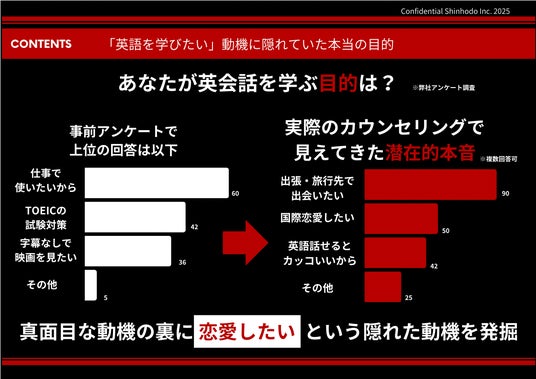 進鳳堂では初回のカウンセリング時にお伺いしている、『英語を覚えたいと思ったきっかけ』と『英語を覚えたら何に使いたいか』という質問を深堀りするうちに、「仕事のため、TOEICのため」という需要の裏に潜む「新しい人に出会いたい」という潜在的な欲求を発見いたしました。