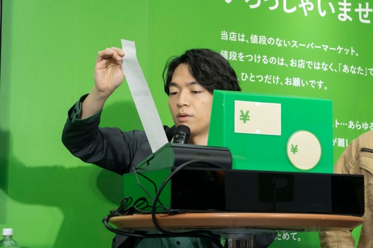 「値段のないスーパーマーケット」開店初日には、QuizKnock伊沢 拓司さんと、専門家の三輪 泰史氏、「道の駅 みのりの郷東金」土濃塚 雅代 氏に登壇頂き、開店セレモニーを開催し、伊沢さんは、日本の食を取り巻く状況についてのクイズに挑戦しました。