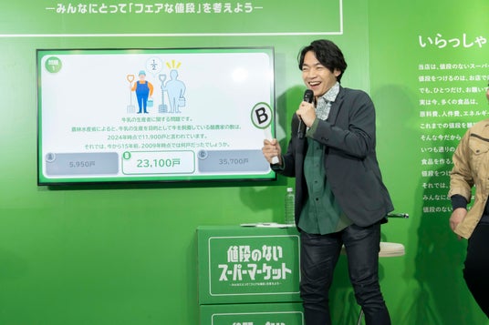 今回のスーパーでは、納豆、豆腐、牛乳、にんじん、玉ねぎが値段のついていない状態で販売されており、その代わりに生産や製造、流通、小売を取り巻く現状やデータが書かれたパネルが展示されました。参加者の皆さまには、これらの値段について考えるヒントをもとに、売る人、買う人、育てる人、みんなにとって「フェアな価格」とはどうあるべきかについてを考えていただきました。本スーパーには4日間合計で約8,200名の方々にご参加いただきました。