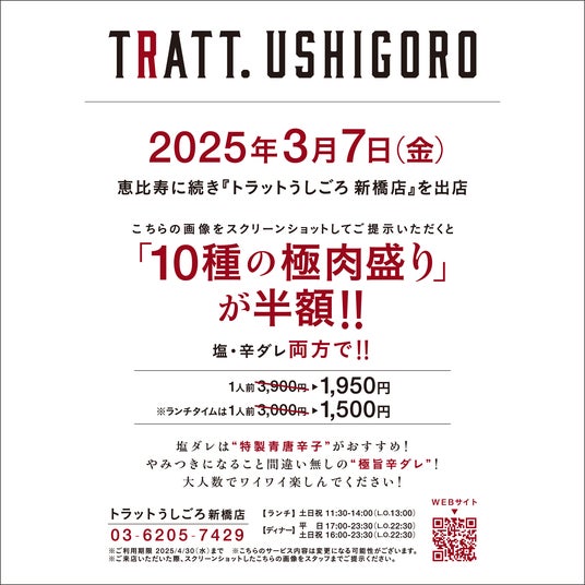 『TRATT. USHIGORO 新橋店』オープン記念「10種の極肉盛り」が“半額”になるスクリーンショットキャンペーンを展開! 本日、2025年3月7日[金]グランドオープン!