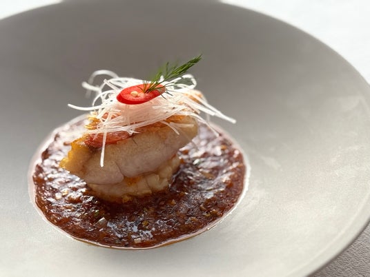 静岡県産の金目鯛を贅沢に使用した一品。からりと揚げた肉厚のホタテ貝の上に、中華鍋で鱗ごと香ばしく焼き上げた金目鯛を添えています。泡辣椒(パオラージャオ=塩や香味野菜と漬けた唐辛子)に、生姜やピータン、酢を加えたさっぱりとしたソースで仕上げました。香りはもちろん、四川料理特有の奥深く上品な辛さとのバランスもあわせてご堪能ください。
