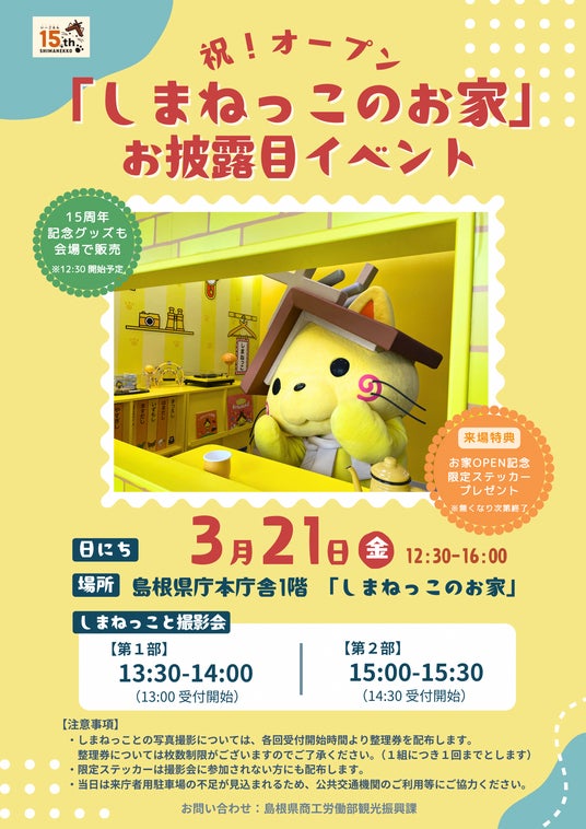 2025年2月19日、島根県庁に新しい「しまねっこのお家」がオープンしました。この度、オープンを記念して、多くの皆さまにお家をお披露目し親しんでいただけるよう、ふれあいイベントを開催します。