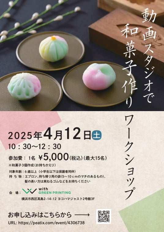 今回、with GREEN PRINTING初となる「動画スタジオで和菓子作りワークショップ」を開催いたします。和菓子作りを通じて、日本の伝統や職人の技に触れられる貴重な体験となります。美しい四季の表現や、おもてなしの心を感じながら、日本文化の奥深さを感じてみませんか?