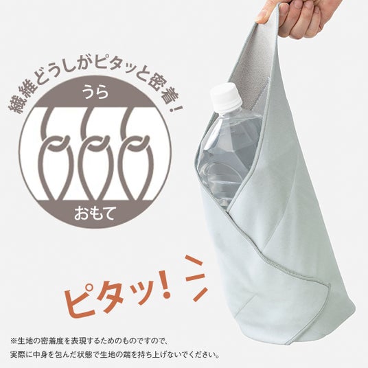 マイクロファイバーの特殊な繊維構造による、クロスの表面と裏面を重ねることでくっつく機能性を活かし、お子さんもお年寄りの方も巻くだけでピタッと簡単に包めるのが特徴です。タテ型のお弁当箱やペットボトル、おにぎり、バナナなど、物のかたちに合わせて自由自在に包むことができます。また、内側にはアルミ蒸着フィルムを縫い付けたことで、保冷剤と一緒にお弁当箱などを包めば保冷もできるため、これから暖かくなる時期に安心してお使いいただけます。更に、マイクロファイバー素材のため保冷剤やお弁当が結露しても水分を吸収してくれるのでカバンなどが濡れずにすみ、自宅で洗えるのも嬉しいポイントです。