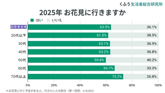 2025年の春、回答者全体で63.9%の人がお花見に「行く・行きたい」と回答しました。年齢別では、50代までが約6割、60代以上では約7割の人が今年のお花見を考えていることがわかります。
