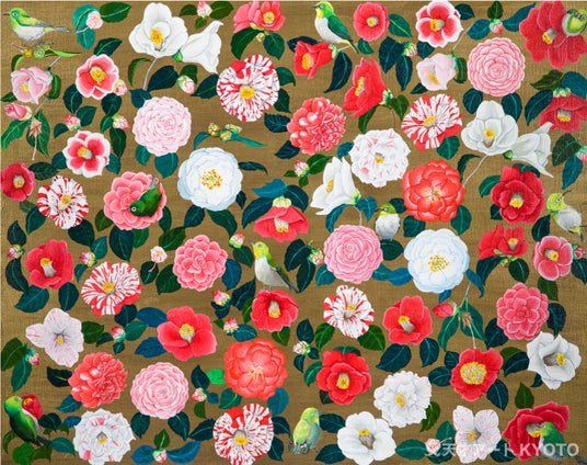 今回の展示では大場多知子氏、水玉みり氏、Nemuro氏、若林義輝氏などの作品を展示いたします。なかでも大場多知子氏の作品「椿」は、地元京都の酒蔵である「佐々木酒造」にてオリジナルラベルの日本酒を作成し、年始ご宿泊のお客様限定でご提供して大変好評でをいただきました。