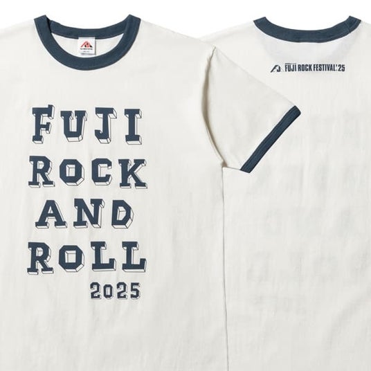 FUJI ROCK AND ROLL '25 リンガー Tシャツ先日発売されたロングスリーヴTシャツに続き登場。今年のリブの色はデニム。プリント色もデニムに統一。