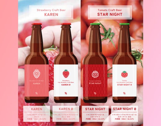 左:いちごクラフトビールとノンアルコールビール 右:トマトクラフトビールとノンアルコールビール