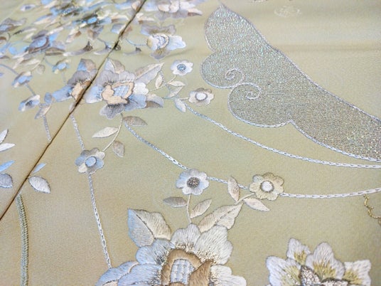 特徴:丹後ちりめんを使用し、職人の手による引き染めで染色。季節感のない洋花の手刺繍が施され、鶯色の上品な色合いが華やかさと落ち着きを兼ね備えたデザイン。