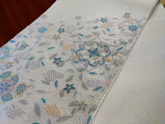 特徴:西陣織の生地に、繊細な相良刺繍を施した帯。フォーマルからセミフォーマルまで、通年で着用可能な逸品。