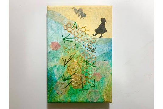 土地の歴史や自然・そこで得た自身の身体感覚から、過去と現在への繋がりを探り作品にしている。手すき紙のコラージュや接着剤、刺繍、ドローイングなどを組み合わせ、平面作品やインスタレーションを制作する。今回は新緑の北軽井沢スウィートグラスで過ごした時間を、自分の身体で感じた記憶を元に小さなコラージュ作品を制作した。