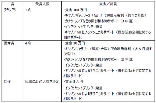 一次・二次・三次選考を経て優秀賞(5名)と佳作(人数は協議による)を選出し、グランプリ選考会にて優秀賞の中から1名をグランプリとして選出します。入賞者にはそれぞれキヤノンMJからの機材サポートのほか、キヤノンギャラリー S(品川)やキヤノンギャラリー銀座・大阪での作品発表の機会などを提供します。応募者の年齢・経験(プロ・アマチュア)は問いません。 選考委員は、さまざまな分野で活躍する5名で、第3回では新たに4名の選考委員を迎えました。それぞれの独自の視点で作品のクオリティーに加え、コミュニケーション力や行動力、情熱、将来性なども含め総合的に選考します。