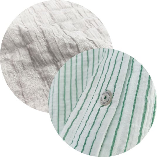 NARUE COMPANY LIMITEDイチオシ素材「シャーリングWガーゼ」生地に自然なシワと凹凸感を生み出す「シャーリング加工」を施した、コットンのWガーゼ素材。