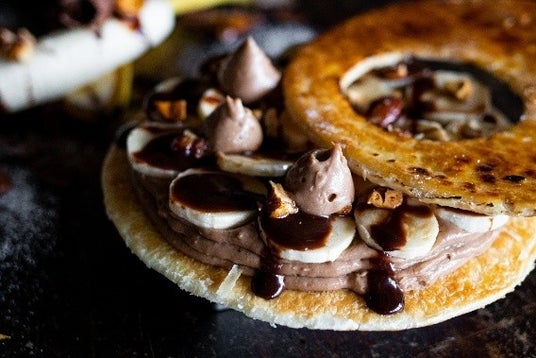 ショコラのカスタードクリームとバナナを使用した王道の一品。クーベルチュールショコラクリームに完熟バナナと香ばしいキャラメルナッツ