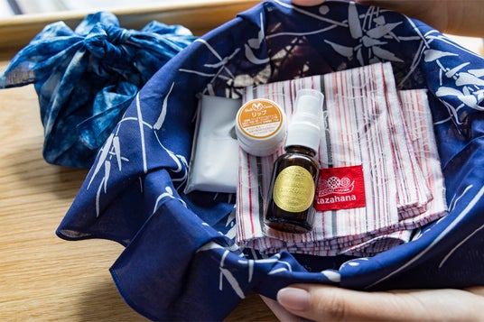 地域産のハンカチ、リップクリーム、ハンドスプレーを各お客さまに