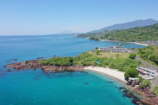 三方錦江湾に囲まれた絶景のロケーション。プライベートビーチに磯もあります。