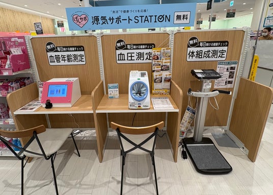 当店では、売場内にお客さまご自身で体の状態を測定できる「源気サポートSTATION」を設置します。「体組成計」「血圧計」「血管年齢計」で、気軽に健康状態をチェックできます。
