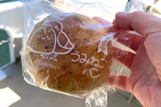 「宮古うみねこ丸」の船内では、うみねこパン(1個200円(税込))を購入しウミネコの餌付け体験ができます。アカモクなどの海藻が練り込まれているためほんのり磯の香りがするパンは、ウミネコも人も美味しく食べられます。うみねこパンの製造は宮古市内の障がい者就労支援事業所「SELPわかたけ」、パッケージイラストは市内で活動する「ArtEriy’s」が手がけています。「宮古うみねこ丸」に乗船した人のみがこのパンを購入できるため、お土産として持ち帰っても話題が広がります。