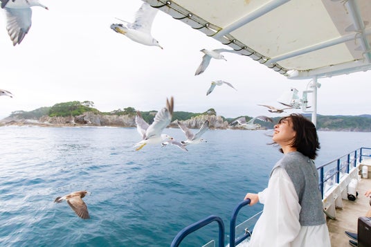 遊覧船のデッキでは野生のウミネコへの餌付け体験が可能です 船内ではうみねこパンを販売中です