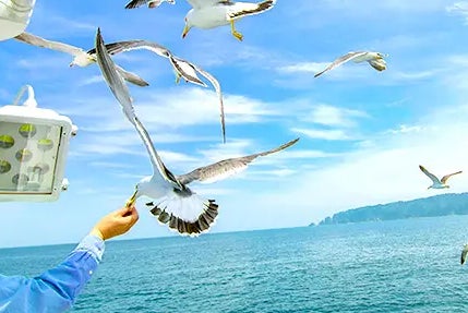 なかなか近くで見ることができないウミネコを間近で見られるチャンスです。船内ではウミネコのエサを販売中です。