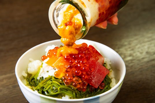 朝食には、一杯に詰め込まれた具材を豪快にご飯にぶっかけて盛り付ける体験型海鮮丼「瓶ドン」をご用意