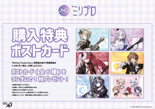 『ミリプロ』の新作グッズを含む関連商品を1会計で2,200円(税込)お買い上げごとに、ポストカード(全6種)をランダムで1枚プレゼントします。