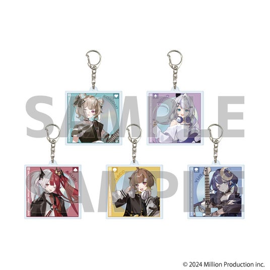 背景に『ミリプロ』メンバーのイメージカラーを取り入れた、大きさおよそ6.5cm×6.5cmのアクリルキーホルダー。カバンにつけるほか、お部屋に並べて飾るのもおすすめです♪
