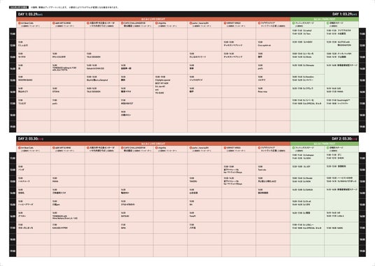 ● にしぇ止三 ● セイタカ ● 凪 ● WOOMIN BAND ● 秋山みどり ● てんむす ● RYU-COとゆき ● TONEBASS talking to YUKI with JULI TOYTA ● OTOHA ● pod'z ● 5atsuki & GYAN ZiZi ● $ky6 & 踏a.k.a.Gangmul ● 金島準一郎 ● 勝詩 ● 種浦マサオ ● 本気のあそび ● 大橋タカシ ● Jaz-t6 ● emi ● YO-SUKE ● たしなみストリート ● 茉寿 ● ジョウカダイゴ ● 徹平 ● チョモランマブレンド ● Coco quArt-et ● エビチリ ● Rosa-rosa ● パンダ ● ハルナユーリ ● 合田礼 ● ハッピーアワーズ ● クマオレ ● さほっちしほっち ● MANA ● 刀祢直和トリオ ● 口笛jam ● TONEBASS with Hime Ikehara (from LA / US) ● KAKUSEI HYPER ● 亀田ゆか ● さちかぜあきの ● SATSUKI ● SiMA ● TAKERU ● 山合圭吾 ● SN ● YonePi ● 八千流 ● 宮下ママレード& her マトリョシカboys ● Tumi-oto ● 月よ星よと眺むJAZZ ● 狐日和楽団 ● DJ seito2 ● DJ Taro ● DJ HiDEV ● DJ いなっち ● DJ Shota ● DJ Shinsuke ● DJ Kenshiro ● DJ スイミー ● DJ ひちょり ● DJ らべーな ● フジワラカズオ ● 小出夏花 ● GLOTUS with 和GOSNATION ● ナンカノユメ841 ● 小山総絵 ● GrB ● MANA ● Good knight** ● シェリコフレ ● DJ kahopan ● DJ GOH ● DJ JOY ● DJ Shodai ● DJ NON ● DJ SANUA ● DJ Di-sK ● DJ ぱせ ● DJ 紫音 ● DJ よねしー ● ぴこ ● SHION ● 安西彩矢 ● ハーピストみゆき ● DJ RAM & ろりぽっぷ ● Aill ● Little-k ● NARU