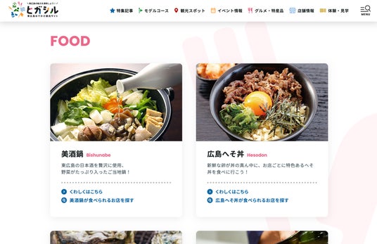 「ヒガシル」では、東広島の観光スポットやイベント情報をはじめ、ご当地グルメ・特産品、東広島市産品を積極的に使用する店舗情報、体験・見学コンテンツ、宿泊施設、交通アクセスなど、東広島へのお出かけや観光に役立つ情報を掲載し、今後もさらに情報を拡充していきます。