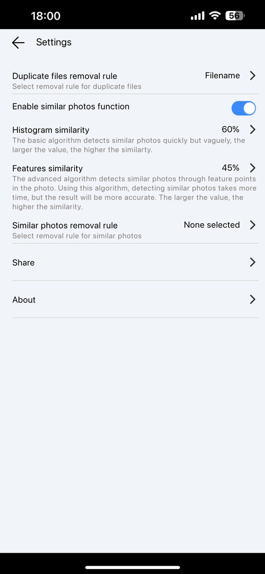 Duplicate Finder(iPhone版)は類似写真も見つけてくれます。例えば見た目が同じですが形式やサイズが違う写真、そして似ているように見える写真です。ヒストグラムの類似度と特徴の類似度を調整して画像を比較し、類似画像を識別できます。カスタマイズ性と柔軟性を実現します。