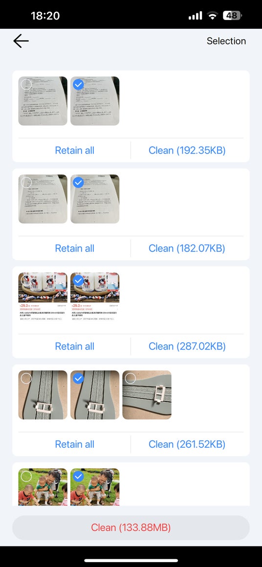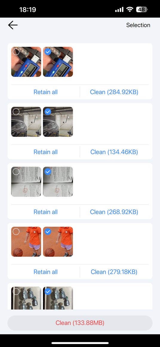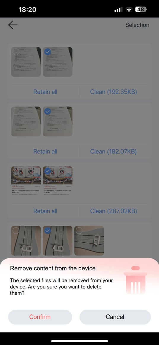 不要な重複写真と動画(そして類似写真)を選択した後、「Clean」>「Confirm」>「Delete」ボタンを順次タップして一括削除します。