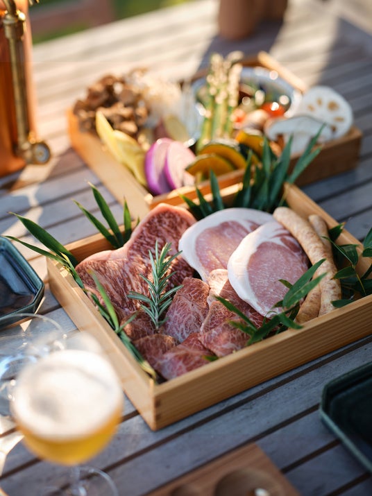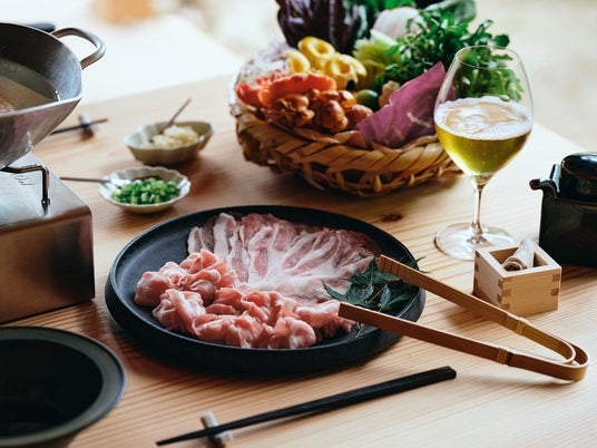 ■夕食(※未就学児以下はオプションでお子様プレート可能。) ・茨城産キャビア ・前菜盛り合わせ(以下は一例) ◆紫キャベツとブルーベリーのブレゼ ◆季節野菜のピュレ ◆れんこんのフリット / ワカサギの包み上げ ◆トマトのコンポート 枝豆添え ◆キャビアフィッシュのタルタル ◆瓜と白魚のガーリックオイルマリネ ・しゃぶしゃぶセット/ 季節生野菜盛り合わせ ・〆のお蕎麦 ・フルーツ