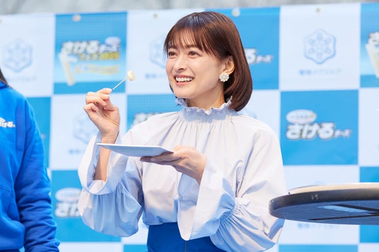また、「さけるチーズフェス2025」で販売しているコラボメニューの中で気になっているものを聞かれると、『大好きなクレープが「さけるチーズ」とどのようなコラボレーションになっているのかすごく気になります。』と回答。その後、コラボキッチンカーで販売している「さけチー焼き」を試食し、「やっぱり美味しいですね!焼くと香ばしくなっていて、チーズの味がぎゅっと詰まっています!」と満面の笑みでコメントしました。