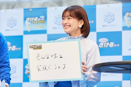 また、乙葉さんが思う「さけるチーズ」のおすすめポイントを聞かれると、「色んな味を家族でシェア!」とフリップで紹介し、『家族で色々な味の「さけるチーズ」を分け合うことができるのも、コミュニケーションの一つとして楽しめるというポイントでおすすめです!』と、改めて「さけるチーズ」の魅力をお話しました。