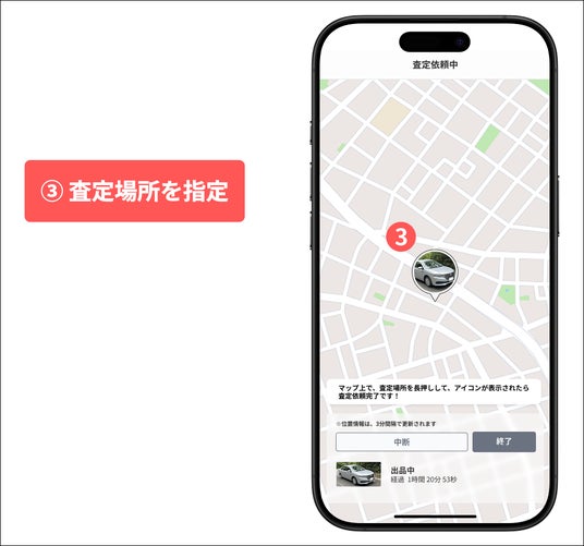 ユーザーは、アプリで査定を希望する日時と場所を地図上に指定するだけで、近隣の買取業者に通知が届きます。買取業者は指定された時間に現地へ行き、査定を実施。事前にチャットで時間の調整も可能なため、ユーザーと業者の双方にとってスムーズな取引が実現します。