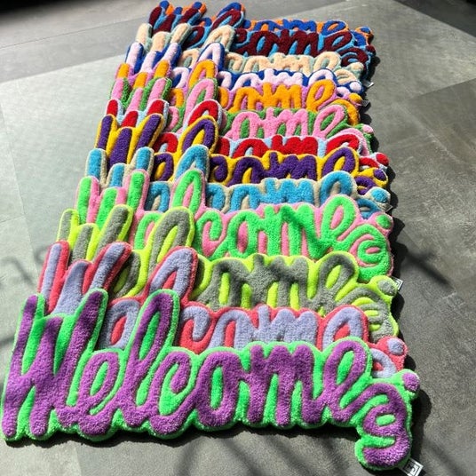 手書きの筆記体がモチーフの定番デザイン「ウェルカムスリードラグ」。単品でも存在感があり、他のラグと組み合わせてもおしゃれ。