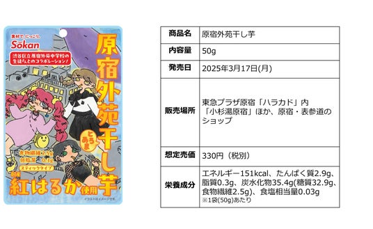 株式会社壮関(本社:栃木県矢板市 代表取締役社長:板山 健一)は、渋谷区立原宿外苑中学校との共同プロジェクトとして、「原宿外苑干し芋」を2025年3月17日(月)に発売いたします。本商品は、同校の生徒がデザインを手がけ、学校の名前を冠した特別な干し芋として誕生しました。