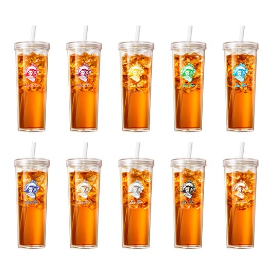 10色のタンブラー×全100種類のステッカーで自分好みにカスタマイズ!アイスティータンブラーに「午後の紅茶 おいしい無糖」を注いで提供