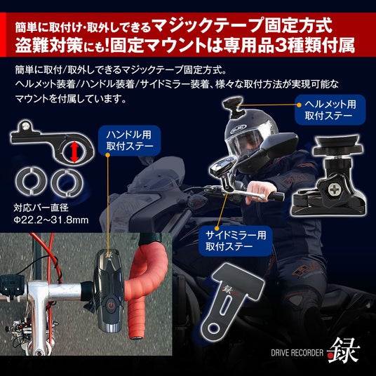 簡単に取付/取外しできる面ファスナー固定方式。ヘルメット装着/ハンドル装着/サイドミラー装着、様々な取付方法が実現可能なマウントを付属しています。