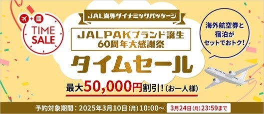 株式会社ジャルパック(本社:東京都品川区、代表取締役社長:平井 登、以下「ジャルパック」)は、期間限定で海外航空券と宿泊がセットになったJAL海外ダイナミックパッケージのタイムセールを2025年3月10日より開始しました。行き先に応じて最大50,000円割引となるほか、アメリカの人気テーマパークの入園チケットが特別価格で予約できるオプション(*1)も販売いたします。例えばハワイの割引を適用した場合、99,900円(*2)となる出発日もあり、おトクにご予約いただけます。また、割引(*3)はゴールデンウイークのご旅行も対象です。この機会に、海外への旅を計画してみてはいかがでしょうか。